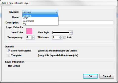 The Level Integration section will show you if this layer is linked to a Takeoff Level. If integration with Takeoff Levels has been set up, all newly created layers for the active division will automatically create a linked level in Takeoff once saved. You establish the level integration by linking your layers in the Digital Takeoff > System Preferences >Integration tab.