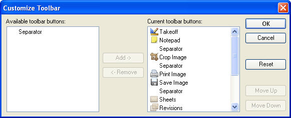 Select a tool bar feature from the right and you can select to add or remove it from the tool bar displayed on your system. You can also use the Move Up and Move Down options to organize the order of your selected tool bar buttons.