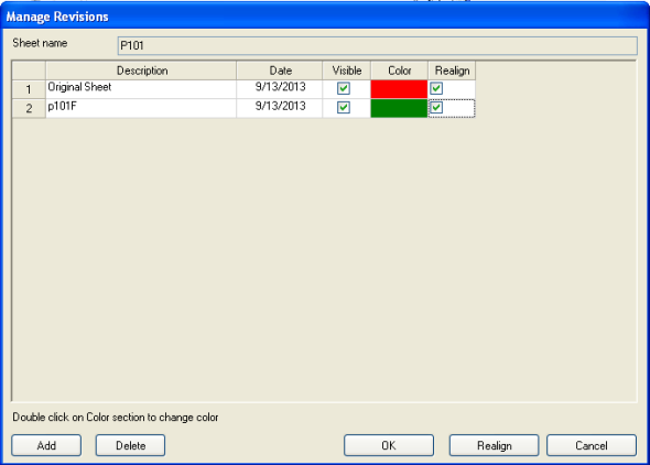 Use the Visible check box to check which revisions you want to see. If only one revision is shown, it will be displayed as it was originally imported. However, if multiple revisions are shown, they will be displayed on top of each other, using the colors (in the next column) to denote which revision a particular line/object/etc. came from.