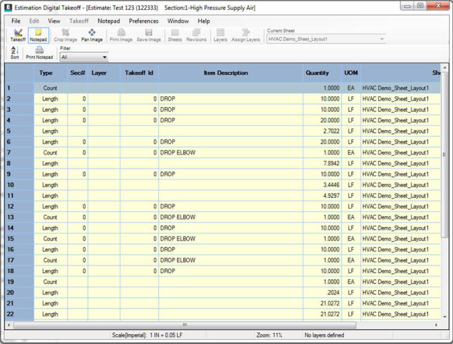 The Notepad in Digital Takeoff is a Summary-like application you can use to organize quantities and items in a very basic spreadsheet format. Each row in the Notepad has a Type, Section Number, Takeoff ID, Item Description, Quantity, Unit of Measure, Number of Segments, Drop Length, Sheet, Reference, and Comment column.