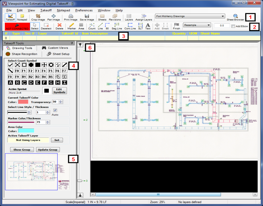 The Takeoff Tools Panel allows you to initially setup your Sheet information, as well as Annotation styles. The Tool box panel also contains the Overview Panel. You can also access Custom Views, which allow you to create alternate views of the Sheet, which can be used as a reference during takeoff.
