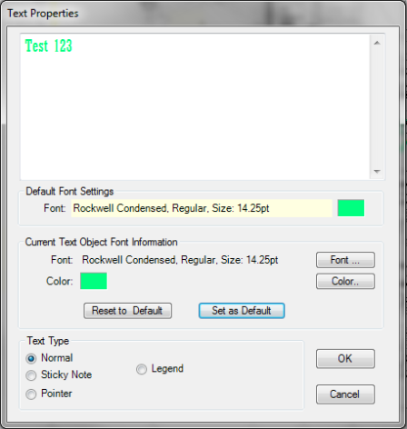 Normal: adds text to your drawing. You can select the font style, size and color. You can make these selections your default settings by clicking Set as Default after making the selections.